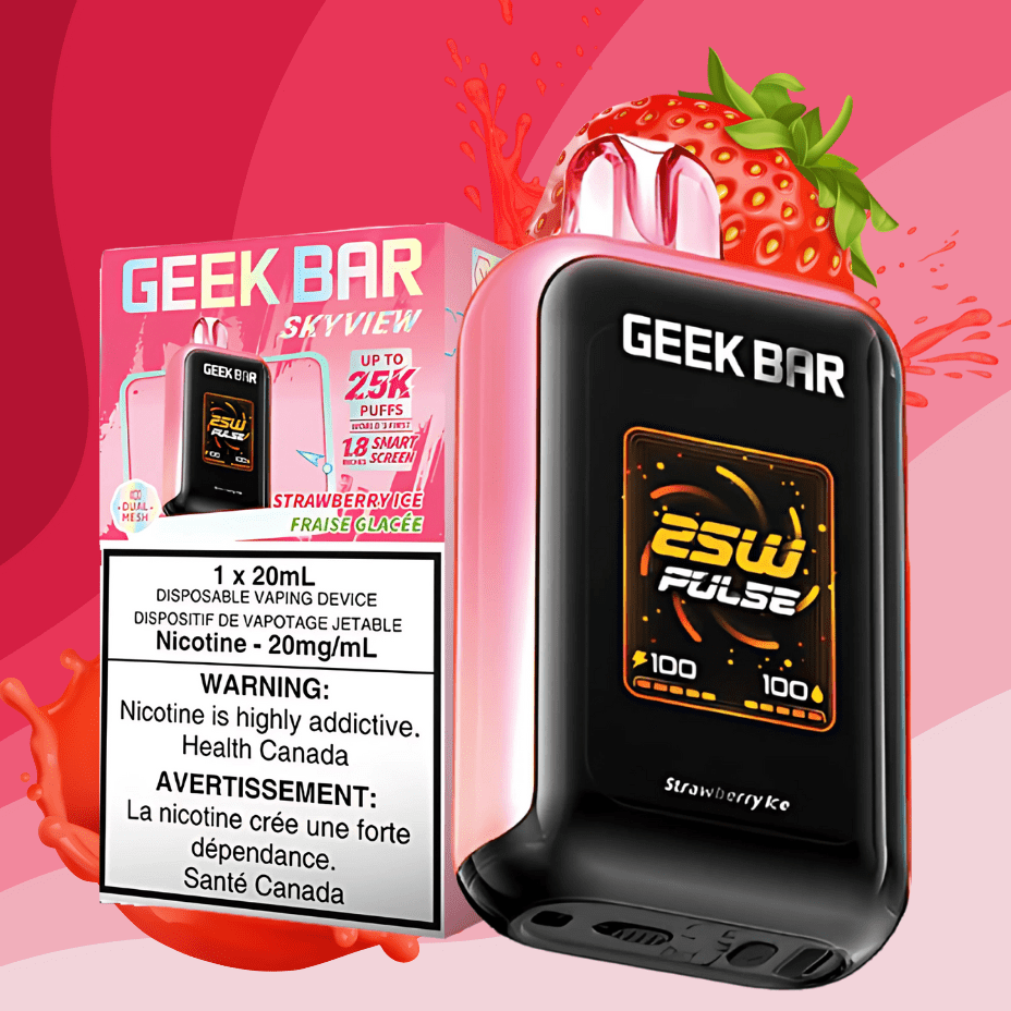 Geek Bar Skyview 25K Disposable vape arrives prefilled with 20ml e-liquid for approximately 25,000 puffs. The Skyview Strawberry Ice is the perfect combinations of sweet juicy summertime fresh strawberries chilled for a perfect fruit vape.
