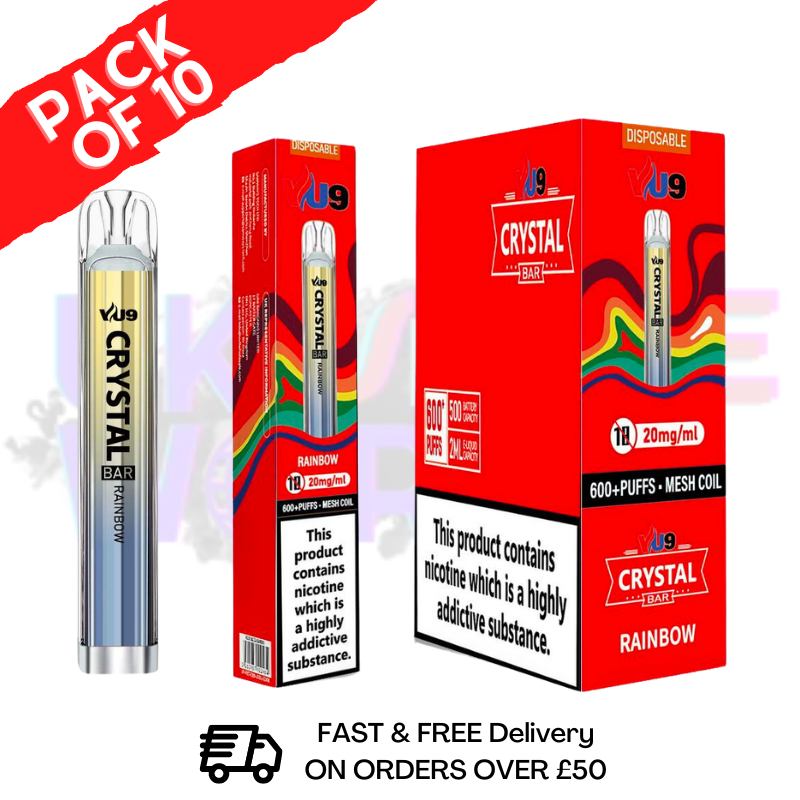 Rainbow Crystal VU9 Classic Pack Of 10 Cheap Disposable share the rainbow fun with your friends and family. Enjoy the sweet, tart and tangy flavours of the classic taste.