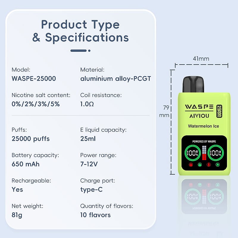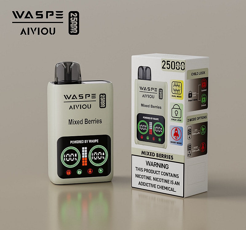 WASPE 25000 25K Puffs Disposable Vape Pen offers a superior vaping experience with an impressive 25000 puffs per device. Available in 0%, 2%, and 5% nicotine strengths, it caters to a wide range of preferences. This device boasts a 25ml e-liquid capacity, dual mesh coils, an LCD display, and a Type-C charging port. Powered by a 650mAh battery, it ensures long-lasting use. Efficiently packed in cartons of 200 pieces, each weighing 21 kg, it is ideal for both individual users and bulk purchasers.