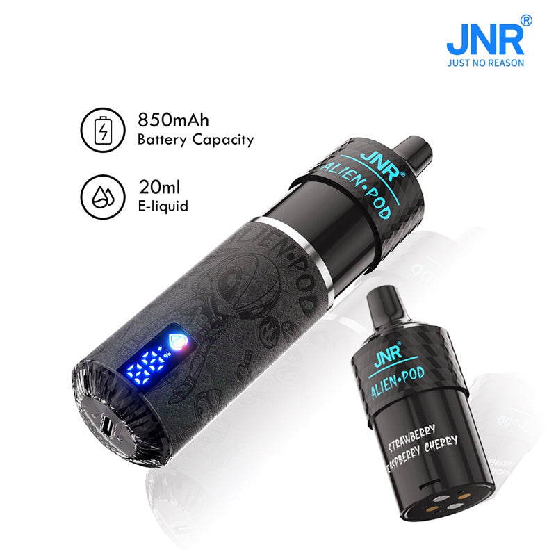 The ALIEN POD features an impressive 20ml e-liquid capacity paired with an 850mAh battery. providing you with everything you need for a robust and enjoyable vaping session. You can easily monitor your battery life and e-liquid levels with the intuitive battery and liquid display. keeping you informed at all times.