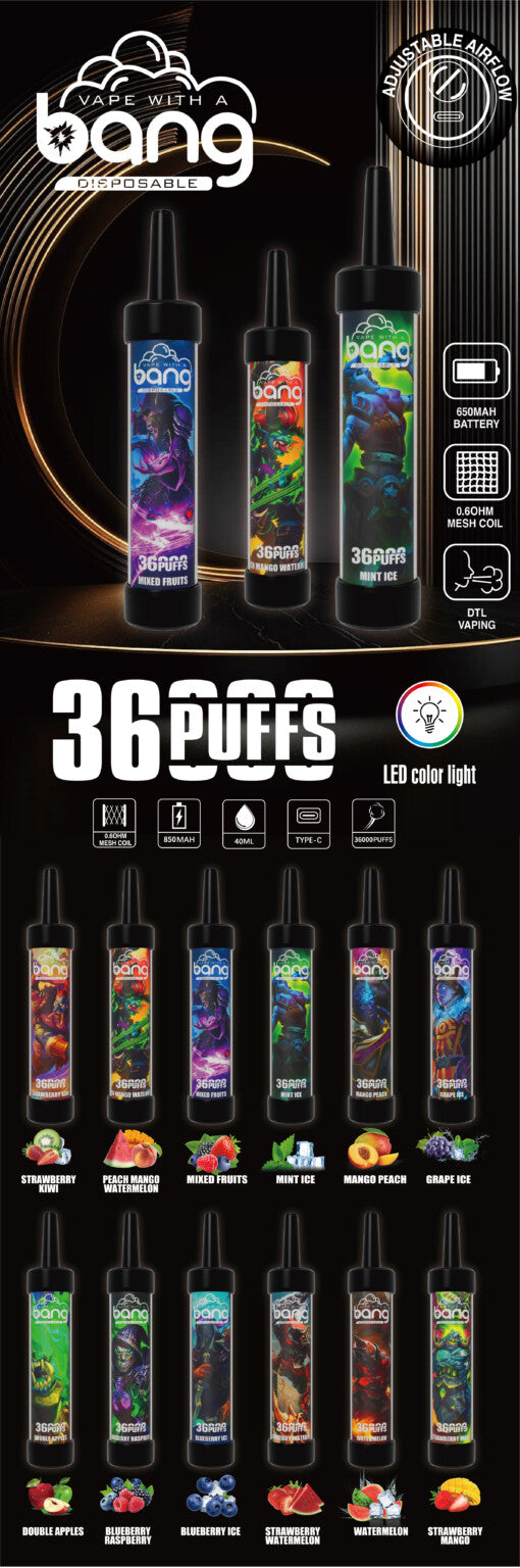Bang 36000 Puffs Disposable Vape -650mAh Battery, 40ml E-liquid, Multiple Nicotine 12 Flavors
